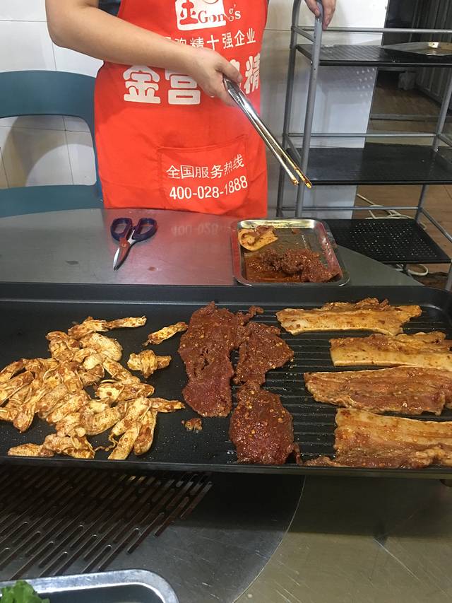很吵,人很多,但是老板很热情,等了一会就可以坐桌了,烤肉是店员帮忙烤,我们点了牛肉、鸭脚筋、五花肉,都是这间店必点