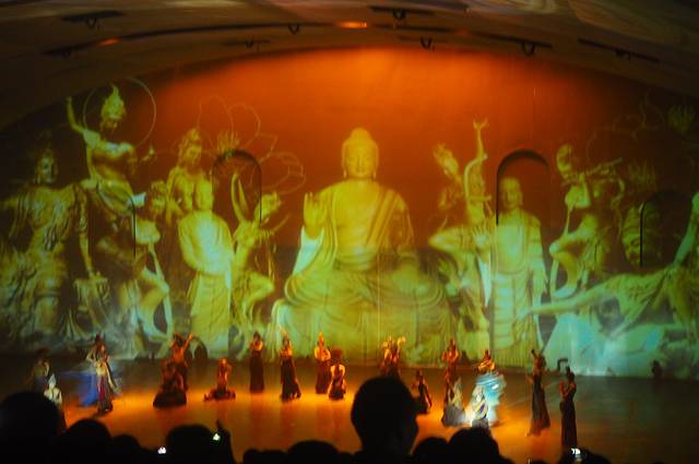 晚上20:30看实景舞剧《敦煌盛典》,沙漠实景演出,观众席可以360度旋转,这点挺酷,其他的都是景点演出,我看的太多了,以前都在舞台上,现在在舞台下看别人跳舞,感觉还是很不错的。