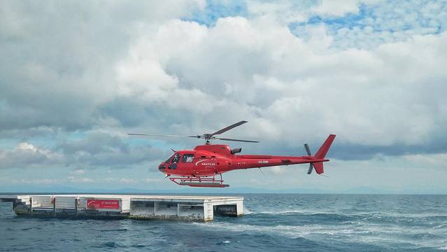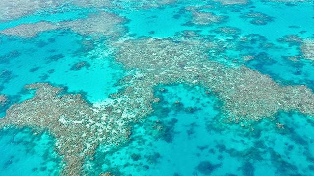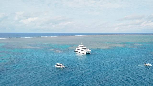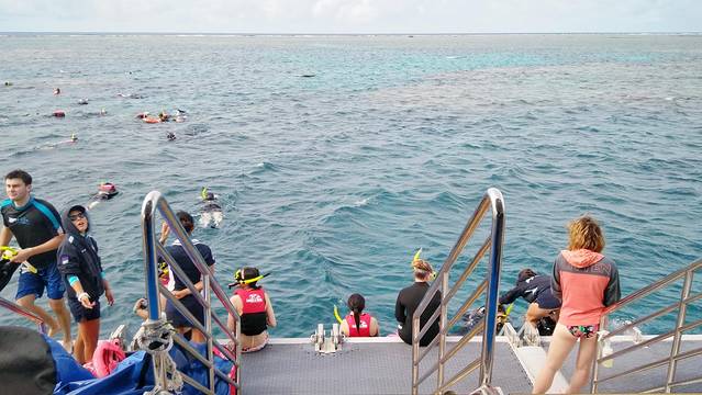 大概一个半小时左右,我们就到了第一个浮潜点,跟随工作人员的指示下海浮潜。比较浅的珊瑚礁在距离抛锚点十米左右的海域,但是我们三人费尽全力也没有游出去。而且六月的澳大利亚,海水还是有点冷的,上来后三个人都瑟瑟发抖(保暖服根本没用啊摔!),于是我们统一了意见没有进行第二次浮潜,等待中午十二点的直升机体验。