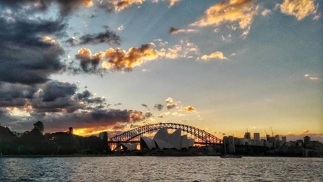 私以为海港大桥才是悉尼歌剧院的最佳拍照点,从桥上可以俯瞰歌剧院以及悉尼的整个南岸的风光,特别是傍晚的时候,夕阳给每一栋建筑物都镀上了金色的光芒,美得不像真实。桥上还有攀登海港大桥的挑战,我们怂,没敢去,就只是优哉游哉地穿过了大桥,路上遇到了许多跑步健身的年轻人。