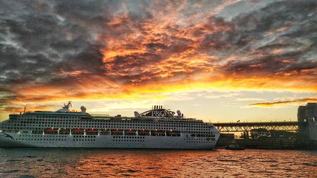 停泊在港口的豪华游轮,那天的火烧云特别美!