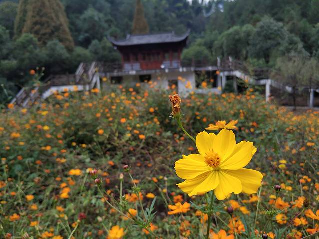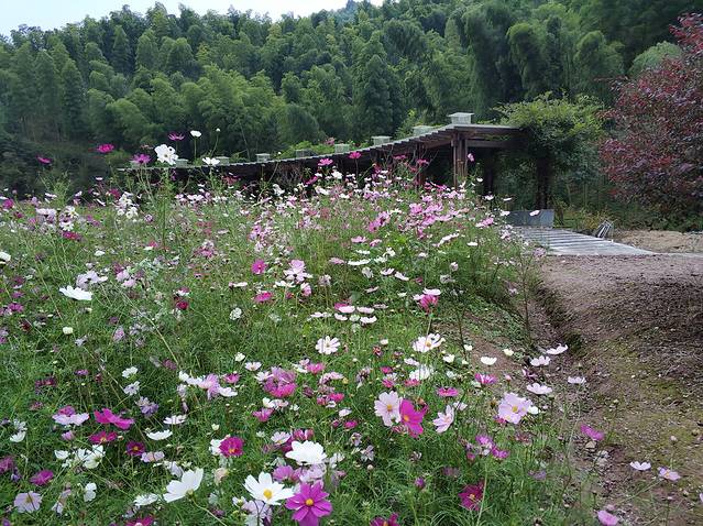 从门口的太极池塘走到水库,路边种满了各种鲜花。