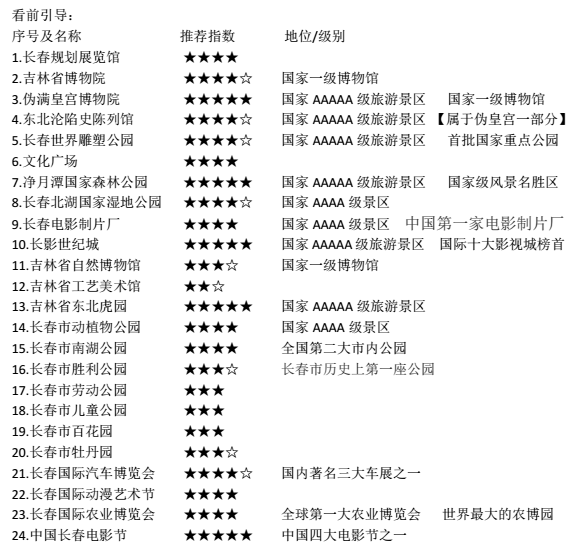 截止2017年, 长春市共有国家5A级旅游景区5个,4A级旅游景区12个。