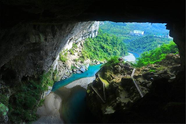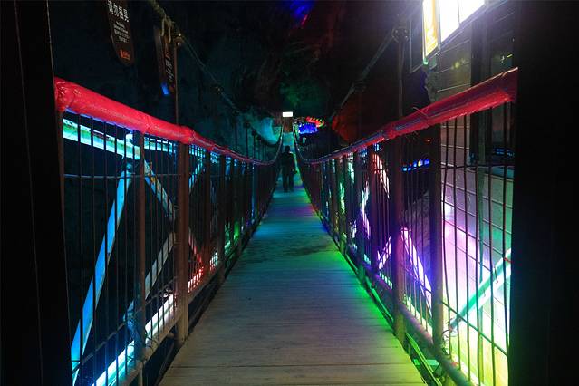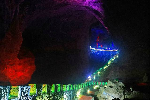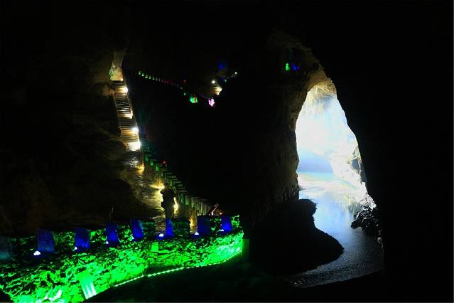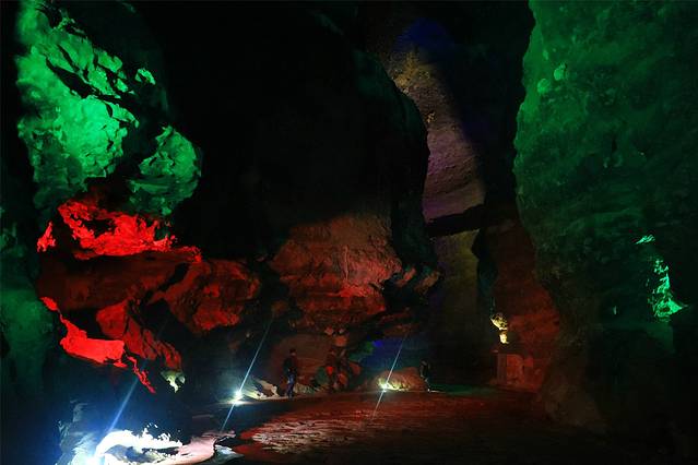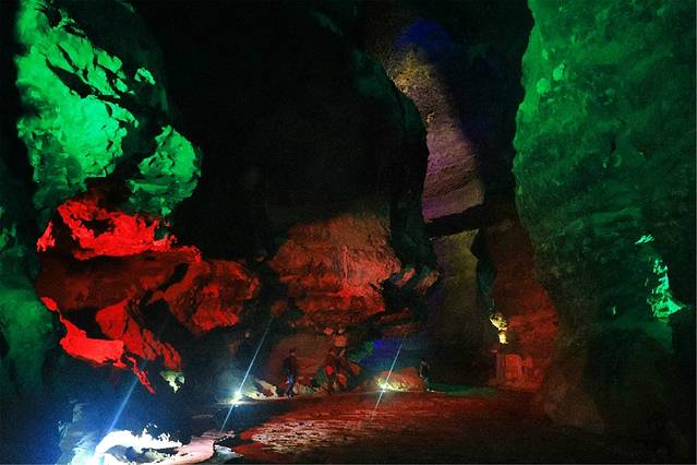 从中洞进来,是一个高一百多米的大厅,导游说我们此刻正站在第三层洞穴的洞口。向上看,巨大的岩溶洞穴裸露着真实的皮肤;向里望去,幽深宏阔的洞内在霓虹闪烁下更加神秘。向下看,百丈悬崖下一泓碧绿的河水潺潺流动。一时间,它的气势,它的深邃,给了我强大的眩晕感。在时空错落中,分不清方向,看不透古今。