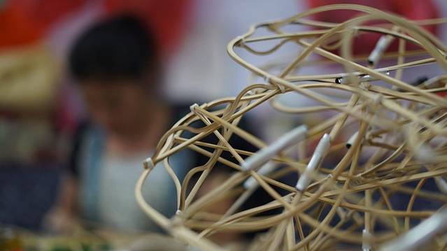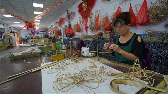 我们小时候常见的燕子风筝,就是杨家埠很擅长的,馆里能看到超大的风筝,也有中小型的,甚至还有微型的风筝。而风筝的制作工艺至今还保留着,我们在制作工坊里看到了明朝风筝技艺的传承。竹子依然是今天制作风筝不可替代的材料,即便轻薄的塑料已经可以替代,甚至超越竹子来进行塑性,但这里依然用传统的竹篾来扎出风筝的形状,必要的时候动用刀,甚至用火焰灯喷烤竹子,让它有一个扭曲的形状。