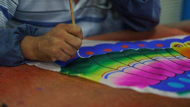 与此同时,风筝的面也在紧张制作中,具有韧性的纸张是经过特殊处理的,在上面悉心作画需要有经验的老工人一笔一笔勾画。虽然印刷已经非常廉价,但杨家埠的风筝都是独一无二的——心情好和心情坏的时候,画工的笔触都是不一样的。