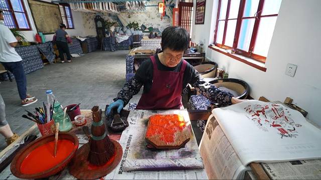 工序到下一步的时候,我们看到了一位老阿姨正在印刷,将板上涂满颜料,一页宣纸翻过来,再轻抚一层就留下了朱红的印记。这些和明朝的工艺并没有发生变化,一切都是老祖宗的样子。