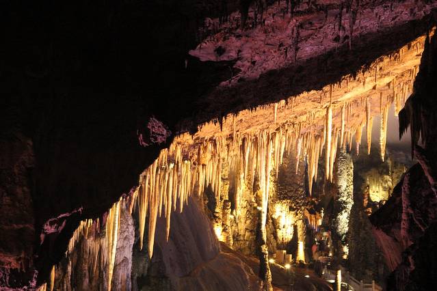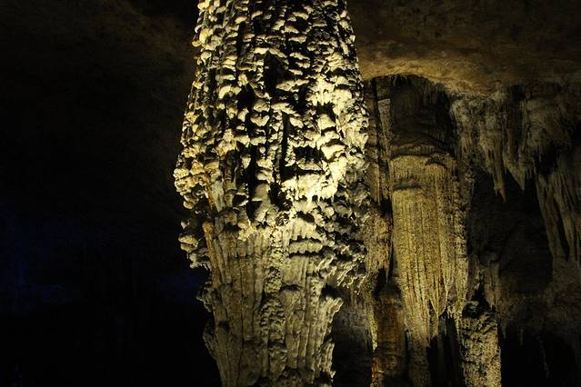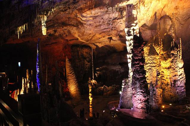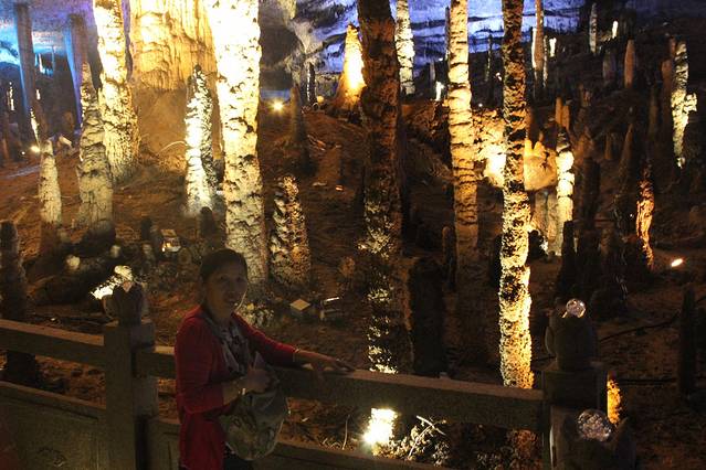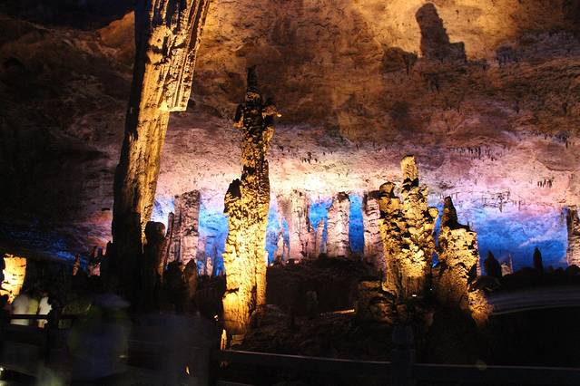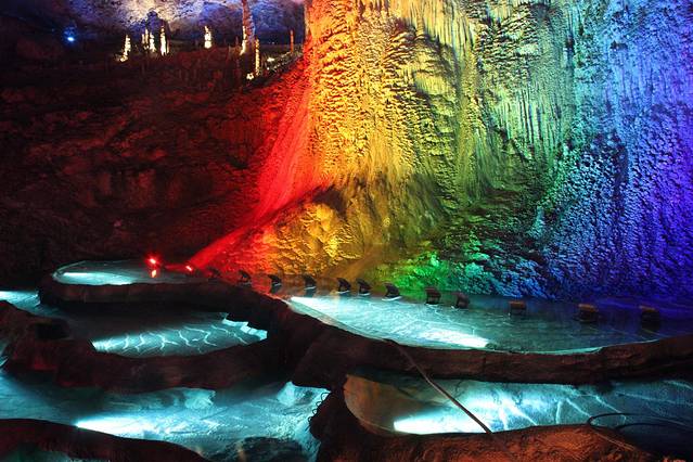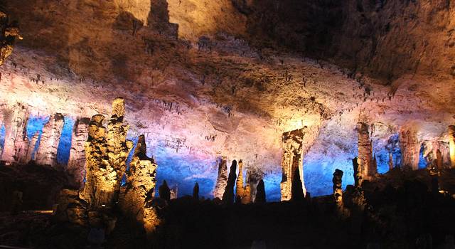 九天洞距市区70公里。九天洞百余处景点、景观堆珍叠玉,藏奇纳秀,神秘莫测,幽深无堰,享有“世界奇穴之冠”、“ 亚洲 第一大洞”诸桂冠。洞分上、中、下三层,最下层低于地表面400多米。洞内36支洞交错相连,内有30余座大厅、10余座洞 中山 、6方千丘田、5座自生桥、3段阴河、3个天然湖、12瀑、3井等景。洞中 石林 密布,钟乳悬浮,岩浆铸成的各种精致景物婀娜多姿。洞中的石笋、 石柱 、石幔、石花、石人、石兽等千姿百态,不可名状,纷呈红黄绿白黑灰诸色,可谓五彩缤纷,琳琅满目。其中九星山玉柱、九天玄女宫和寿星宫三大奇观堪称景绝盖世。九天洞有大、奇、美、幽四大特色,堪称四绝。