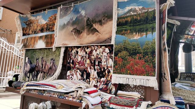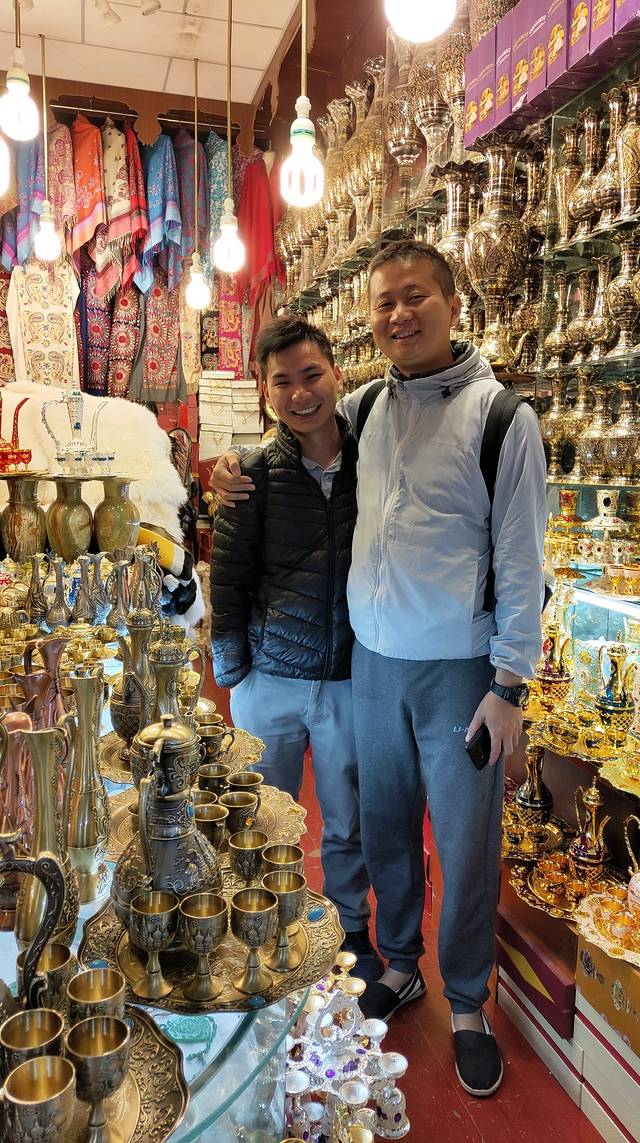 在准备离开大巴扎时,心心念想买一张挂毯,只是朝着出口方向,边走边看,偶尔走进小巷子里,拐七拐八正搜寻挂毯时,老公一阵惊呼,然后看着两个男人手舞足蹈开心的握着手,怎么这是,偶遇熟人了么?😊