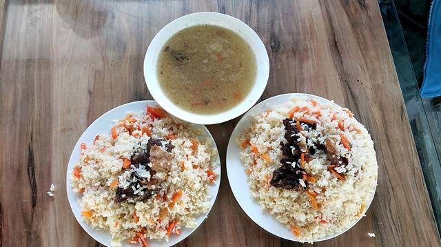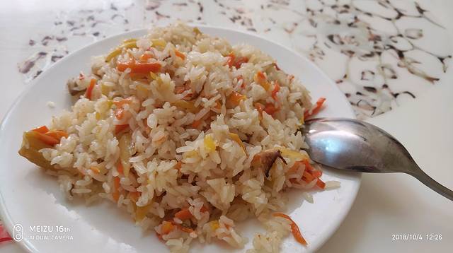 心心念,和老板说一定要吃手抓饭,老板去隔壁买了一份过来,又是一明智决定,因为新疆上菜慢,你点了菜,人家才去买菜然后备菜才炒😂,所以垫着肚子先,抢着吃的味道才赞