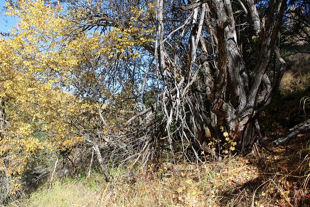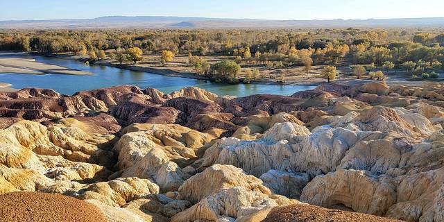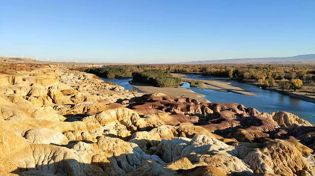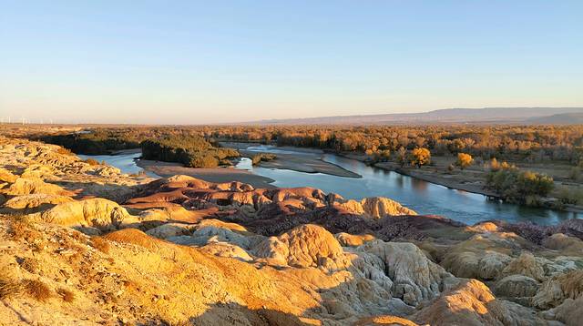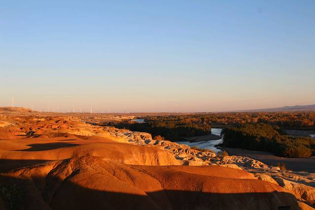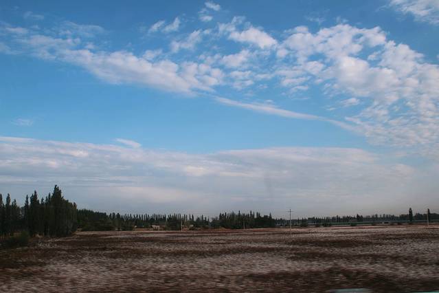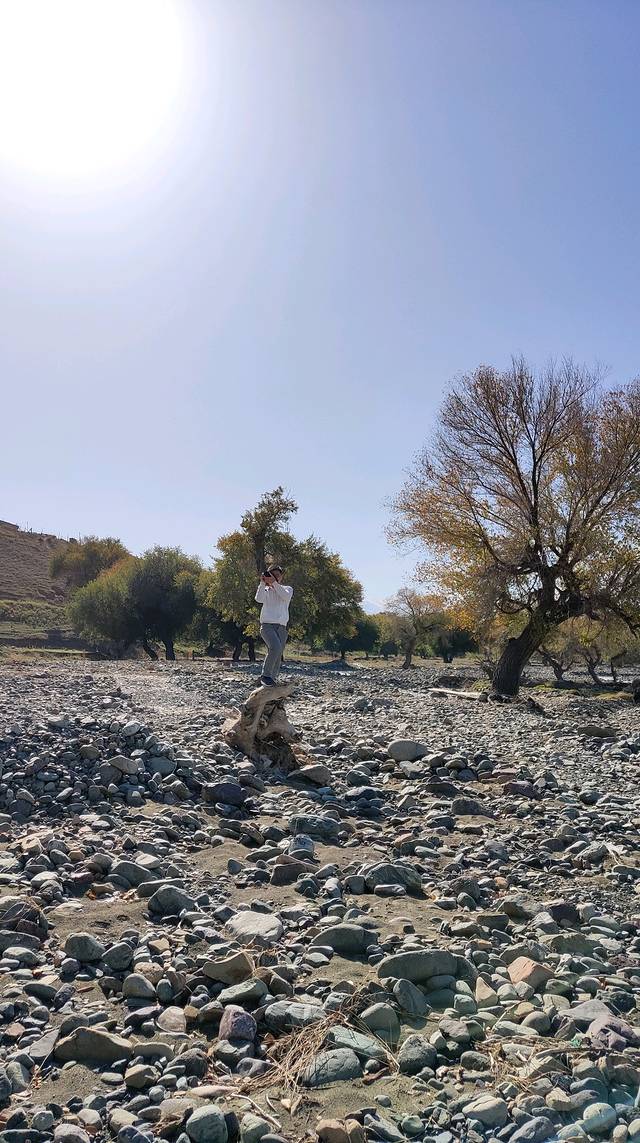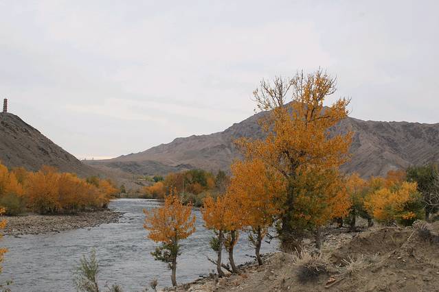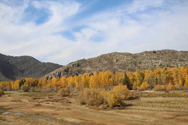 快到富蕴县突现一小河滩,我决定同意大家的要求,下车,一是好不容易看到了“生命之光”的水和树,一天的戈壁着实让人产生了对生命旺盛力的渴望,二是今天的行程已经耽搁了,赶至可可托海镇也已天黑,所以退而求其次的给行程加一个“野滩景点”。
