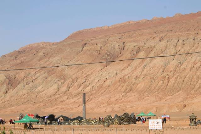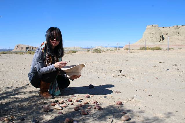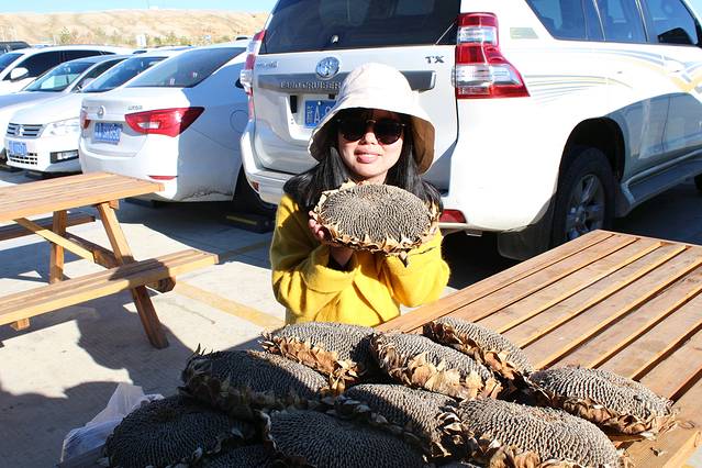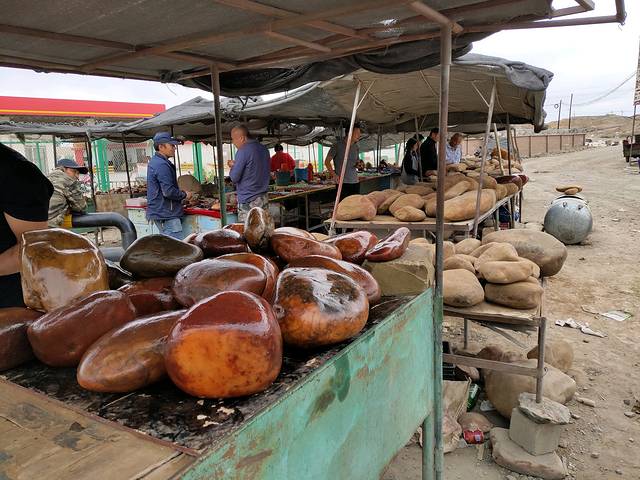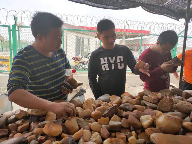 由于中途多次下车,非常烦人限速,所以原本中午到达用餐的恰库尔图镇,下午四点才到达,刘师傅去加油,全车人等下车等待,在旁边的石头摊前打发时间。这一路过来,除了偶尔路边卖石头的摊子,几乎是没有人烟,真的很好奇他们的生意有人帮衬么☺