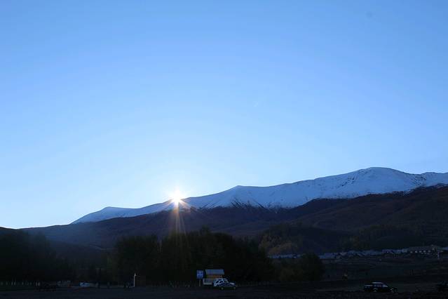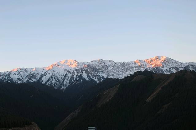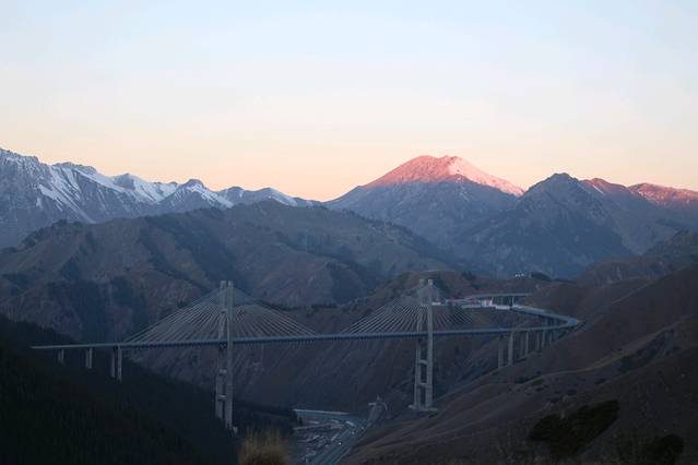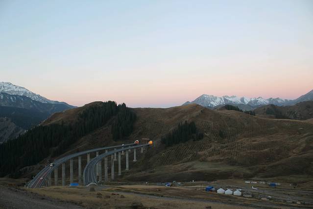 早上一起来,日照金山耶,虽然果子沟大桥就在前面,可是我们得先上山,再下山到山谷,然后再盘旋上山,然后才到桥上😂