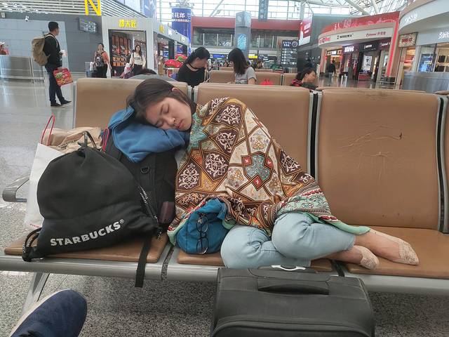 机场补觉的娇娇(高中同学),将这张照片发她老公伟哥,心痛不,谁让你从北京出发😆