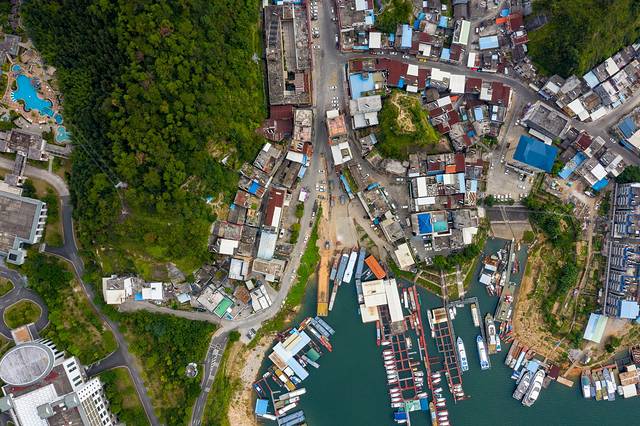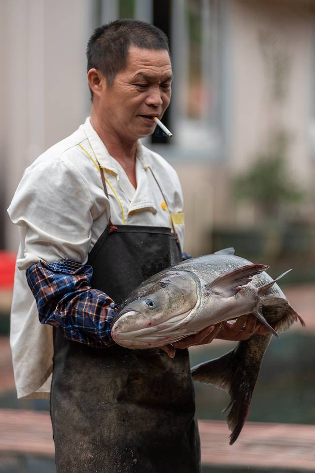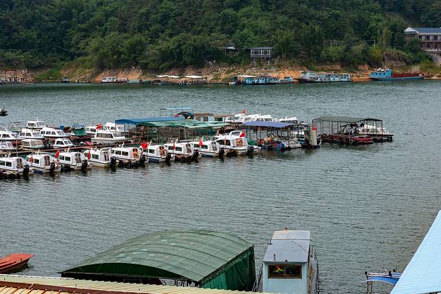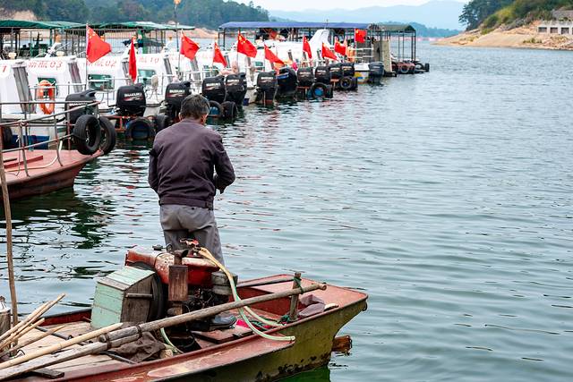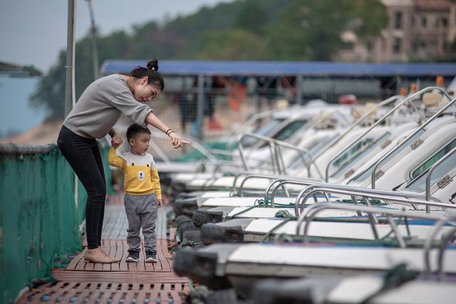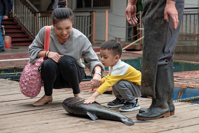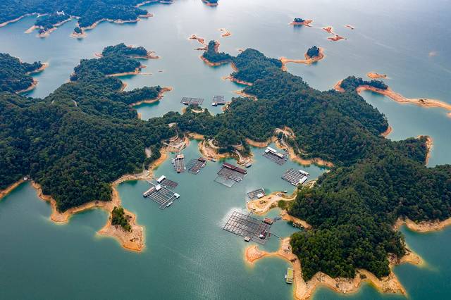 万绿湖畔有一些渔排,网箱内养有一些大鱼供客人挑选。