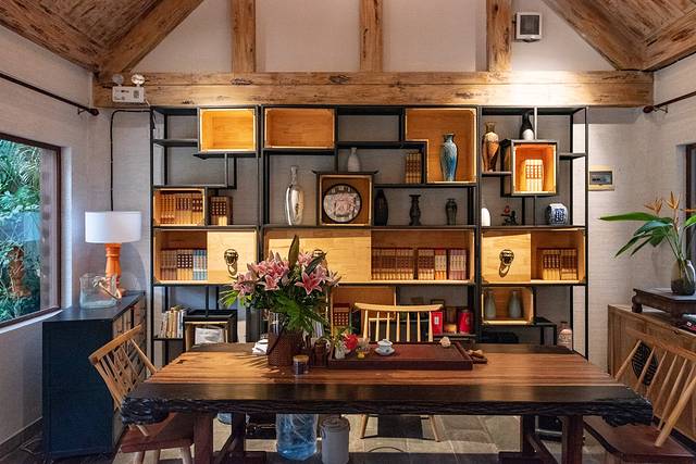另一边是主人和客人喝茶的茶桌,搭配柔和的暖色灯光,让人感觉非常放松,甚至有点慵懒的感觉。