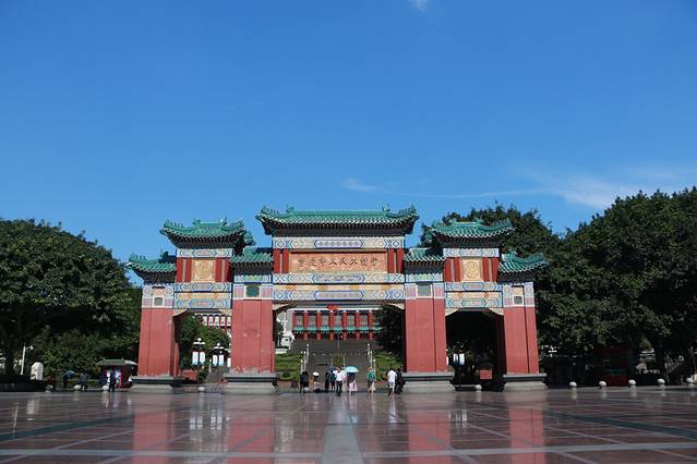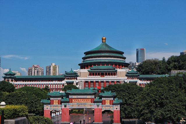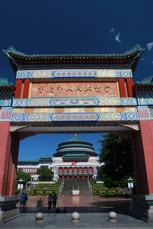 出了防空洞口向左走,前方就是重庆人民大礼堂。人民大礼堂是 重庆 市最大的剧场,光洁的白墙矗立的红柱蓝色的圆顶,建筑十分宏伟,站在门口就能感受到了庄严的气氛。现在这个规模在96年初到此地就这样了,很有气势,仿的北京故宫的建筑风格。进去里面的话要买票,我们想着还要去对面的 三峡 博物馆,就没有买票进去了。