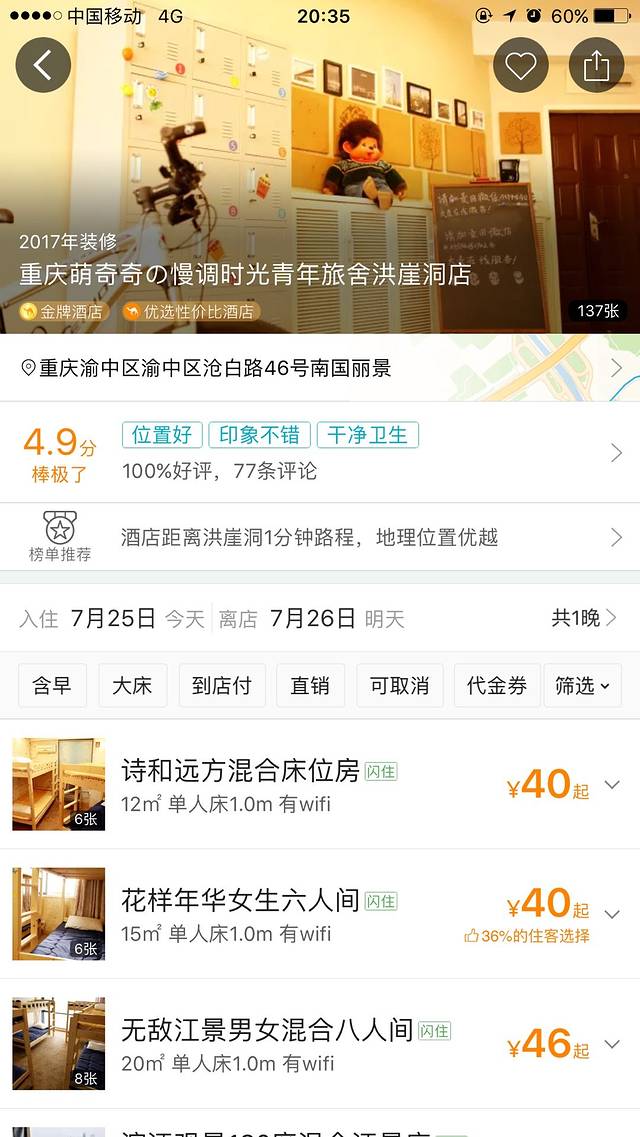 重庆的三个晚上都在蒙奇奇,青旅的地理位置超级好,下了楼就是洪崖洞,走出阳台就是千厮门大桥,360度无死角的江景房,对面就是苍泷火锅店,走十分钟就到达解放碑,阿姨很勤劳,把房子收拾得干干净净。最最重要的,叔叔阿姨超级好,第一天吃火锅胃不舒服,亲自下厨做饺子给我们吃,第二天早上还邀请我们一起喝绿豆粥养胃,临别前,执意要送我们到电梯口……强烈推荐大家去他们家。