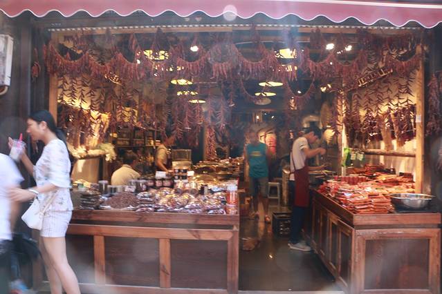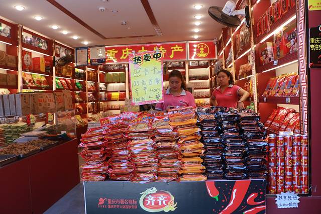 但是中国古镇千千万,大多逃不出那样的套路,我甚至没去之前就可以想象到那儿有什么:花茶啦、奶茶啦、臭豆腐啦这些大同小异的东西。如果非要说出点什么不同,那大概就是扑鼻而来的牛油火锅底料香味了。挂满辣椒的小店格外引人注目,红红火火恍恍惚惚,吆喝声、叫卖声,声声入耳,你可以想象磁器口古镇的繁华。