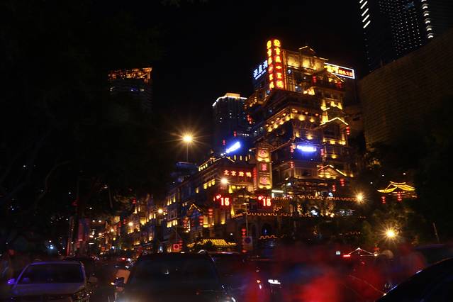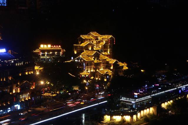 夜晚的洪崖洞多了几分妩媚,车水马龙,它就这样静静地伫立江边,看着来往的车辆,听着人类的喧嚣。