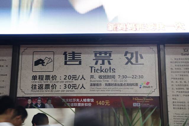 下午6:00,预热还未来得及散开,索道前已经来来回回曲曲折折拍了几百号人,我们还未走进门口,就有黄牛上来搭讪:“你排队至少俩小时,我可以带你去。”“现在索道停开了。我可以带你去。”自从在 西安 被坑,这些坑我都不会跳,不亲眼看到誓不罢休。现在奉上门票几个和开放时间信息一张,下次不要被骗。单程票为20元,往返票为30元。开放时间为早上7:30到晚上10:30。排队大概花了20分钟,虽然队伍排的长,但是一个批次人数也多呀。