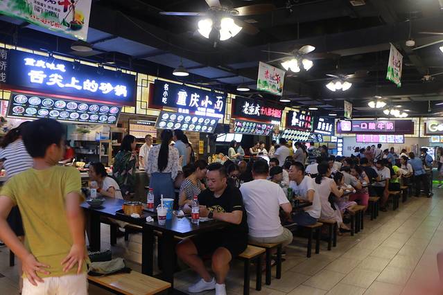吃完晚饭,顺着街道走不到50米,就来到了洪崖洞,夜里的洪崖洞热闹非凡,四楼以小吃为主,但是经过实践味道不咋滴,先顺着手扶电梯下到9楼(我们一开始是在11楼)在第九楼可以坐电梯到达四楼的美食城和一楼江边散步。