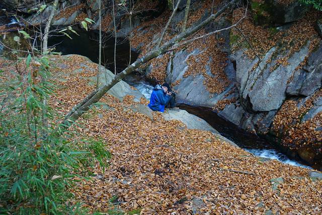 神童潭,奔泻的溪水在坚硬的花岗石河床上开凿出宽50厘米、深约1米,长约15米的石渠,水流翻滚落入潭中
