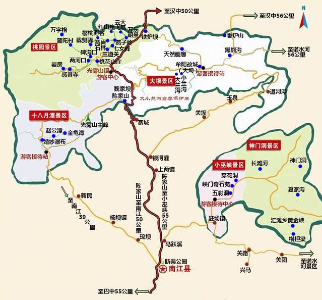 这是南江和光雾山旅游地图,五个景区中神门洞景区尚未开放,今天首站是光雾山镇桃园景区。