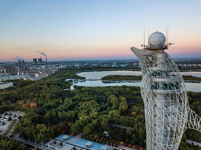 在东湖生态旅游景区里,最显眼的就是外形像海豚一样的西部明珠气象塔了。气象塔总高94.94米,是中国最高的气象塔。地上一层是科普教育区,二、三层为休闲区,乘观光电梯来到14、15层在这里可以俯瞰东湖的全景。海豚顶部的圆球是东湖的天气雷达探测仪,可以监测到半径200公里范围内的天气状况,有着超级千里眼之称。它也是一座集防灾减灾、科普教育与一体的塔楼。