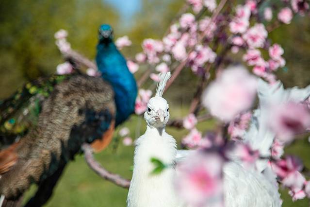 除了能远远的观赏孔雀,在太极湖和观景平台,还能欣赏到“雀跃太极湖”和”千凤祥云“表演。“雀跃太极湖”就是在园区内太极湖面,一群孔雀会从湖心的栈桥飞到岸边,华美的身姿绽放在湖水的倒影里,有意思的是,在太极湖里还有一群小鸭子,在孔雀飞向湖对岸的时候,他们也会跟着努力的游去对岸,仿佛在跟孔雀比赛。而“千凤祥云”则是需要我们爬山中华孔雀苑的制高点观景台来,欣赏孔雀从高处慢慢飞落。就好像《咏孔雀诗》里说的“芳情雀艳若翠仙,飞凤玉凰下凡来。”