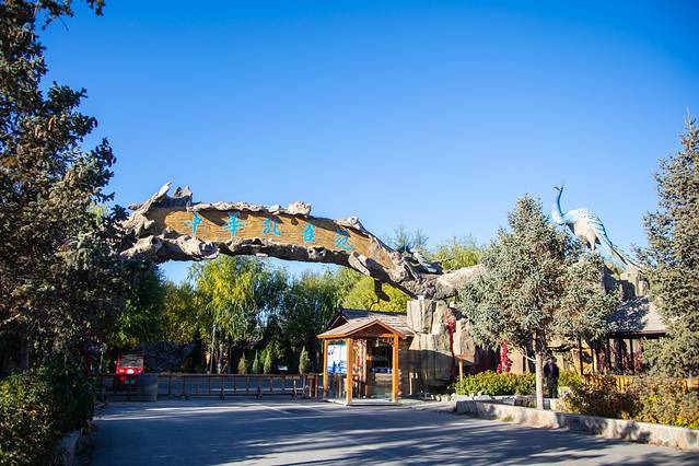 在国内有五大胡杨林:甘肃金塔胡杨林、内蒙古额济纳旗胡杨林、新疆轮台胡杨林、新疆木垒胡杨林、青海省格尔木胡杨林,可谓各具特色。而金塔胡杨林分布密集,树种丰富,最灵秀。从嘉峪关驱车一个半小时,我们终于来到了金塔沙漠胡杨林景区。景区位于古丝绸之路中段北侧、甘肃省金塔县城西北8公里处,由胡杨林-金波湖核心游览区、沙枣林观光休闲区、瀚海红柳林保育区、沙漠康体理疗区和芦苇湿地迷宫区五个功能区组成,占地面积达8万余亩,是河西走廊规模最大的人工种植林。