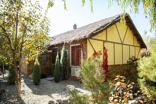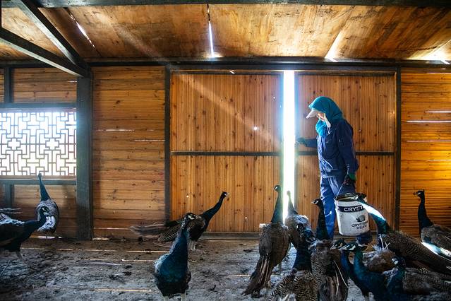 孔雀园里还配套有田园客栈,屋外的小院子和屋内的孔雀元素、木质装饰,都让人有归园田居般的放松自在。