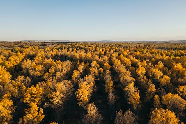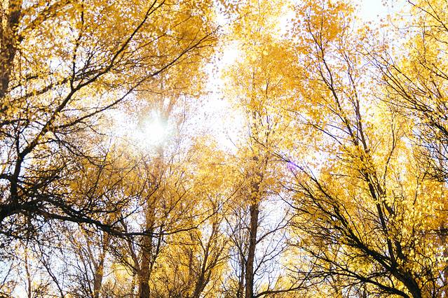 我们的车从景区大门一路开到了情侣树、烽火台,满园的秋意扑面而来。每年十月,大片的胡杨林由绿变黄,一眼望去,阳光下金色的树叶衬着湛蓝的天空于风中婆娑起舞,那种强烈的反差,鲜明的影调,亮丽的色彩,足以令任何语言文字显得苍白无力。