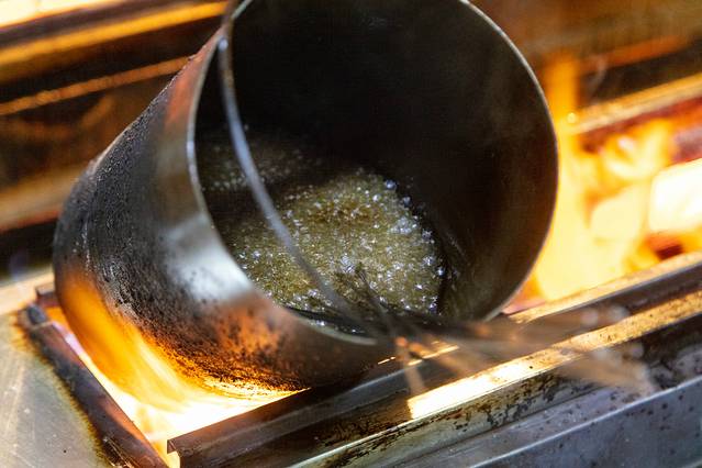 嘉峪关烤肉串和我之前吃的烤肉做法不同,我们发现在烤炉边上放有一个小桶,里面也是被烤的沸腾的热油,厨师先将羊肉在路上烤到表面稍稍变色,然后就马上将肉串放入热油桶中涮两下,感觉就像在油炸,之后再将肉串放回炉上飞快的在炭火上滚动着,最后撒上孜然、辣椒等调味料。