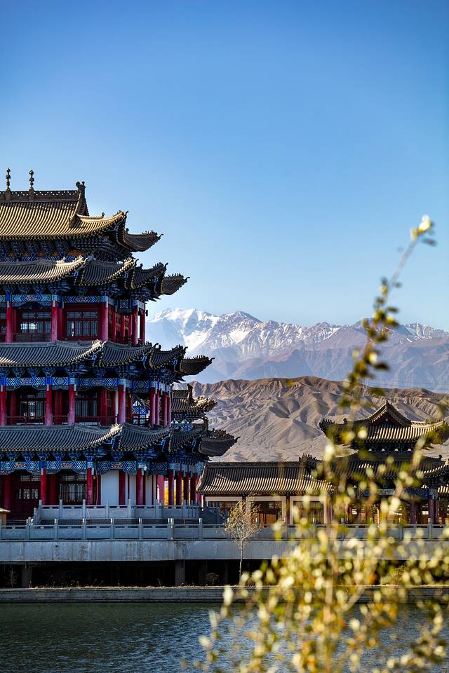 这里是嘉峪关市新建的面积最大的湿地公园,湖是人工修建的,到了晚上有喷泉和水幕电影。河岸边的仿古楼跟嘉峪关城楼遥相呼应,天气好的时候背后的雪山轮廓清晰,景色迷人。