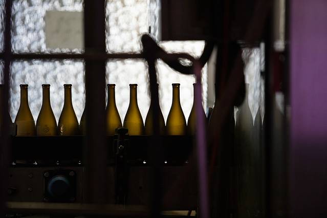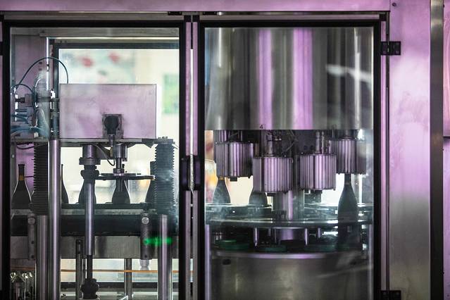 进入参观通道首先看到的是一条灌装线。这条生产线是从意大进口,每小时可生产葡萄酒7000瓶,生产效率非常高。我们的参观是从最后一道工序往前走的,首先看到的是成品酒码垛机,到了这里的酒,就可以进入到库房随时出售了。接着是封箱机,作用是封住箱子上面的胶带。再过来是装箱机,作用是往箱子里装酒,每箱可以装6瓶酒,每次可以装4箱。然后是纸箱制形机,将扁平的纸箱折成形状,然后封住箱子底部的胶带,箱子封好后会运输到装箱机的位置。紧接着是贴标机,正标和背标是同时完成的。热缩帽机,我们在开红酒的时候会看到一个塑料胶帽,就是用这台机热缩完成。然后是烘干机,作用是烘干瓶身。灌装线核心是三联体机,它完成空瓶清洗消毒、灌酒和打塞的全过程,是完全密封的无菌灌装。注完酒到打塞的间隔时间也非常短,保证葡萄酒最原始的品质不被破坏,最后是空瓶卸垛机。从空瓶上线到成瓶酒打包好下线,通常只需要10-15分钟就可以完成。