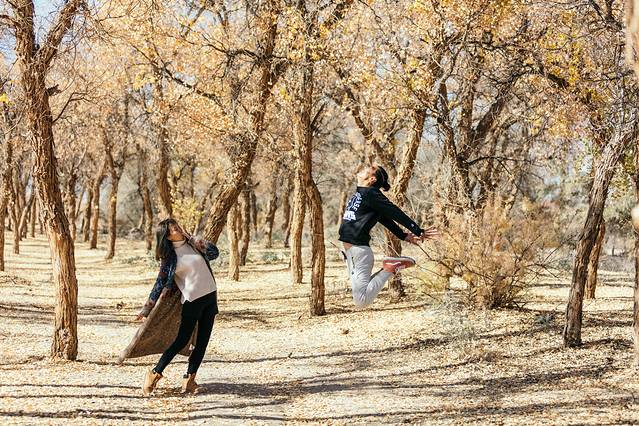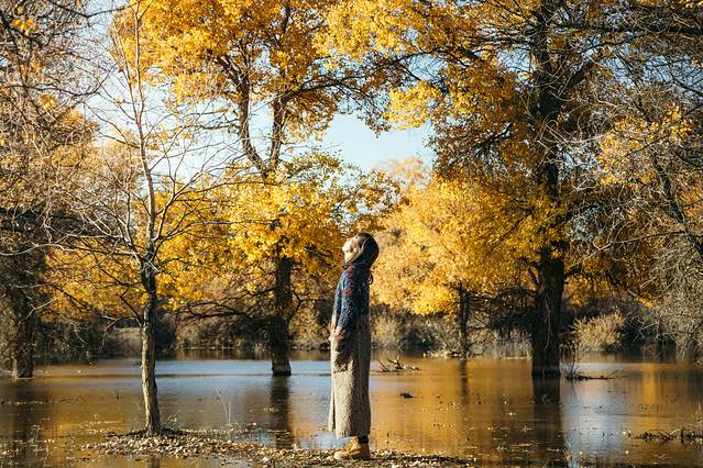 我们沿着栈道,漫步在胡杨林中,树枝的形态千奇百怪,神态万般,树皮上不规则的纵裂沟纹,就像岁月在它身上刻下的印记。忽来一阵秋风,胡杨金黄的叶片,飘飘洒洒地落到地面,大地铺上了金色的地毯,辉煌而凝重,眼前这般场景仿佛神话中的仙境。