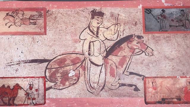 在出土的砖画中最有名的应该是五号墓中的这幅驿使图,它正是中国邮政的标志的来源。砖画上一个邮驿使骑在红鬃马上,头戴进贤冠,身穿右襟宽袖衣,左手举木牍文书,右手持马缰,驿骑四蹄腾空,马尾飞直,显出速度之快,而且驿使的五官唯独缺了嘴巴,也暗示着他的职业操守。