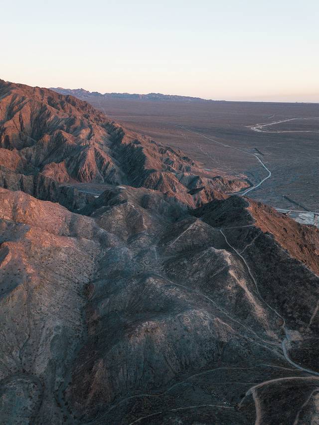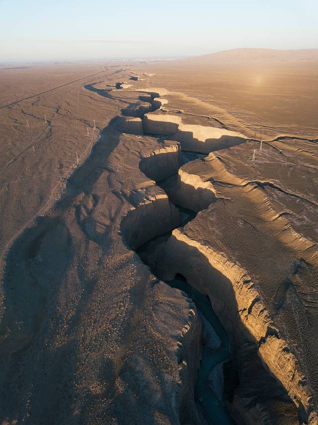 依依不舍的离开黑山湖,我们终于赶在日落前来到了讨赖河大峡谷。与长城第一墩景区里的不同,我们到的这一段峡谷尚未被开发。从黑山湖开车过来约半个多小时,沿着高速下来后一直往戈壁里开。车子被戈壁上的石子颠得上上下下,突然在一个悬崖边停住了。下车后,大家都不禁发出了“哇”的惊叹。沿着峡谷的边缘一路往前走,我第一次有大地就在眼前裂开了的感觉。