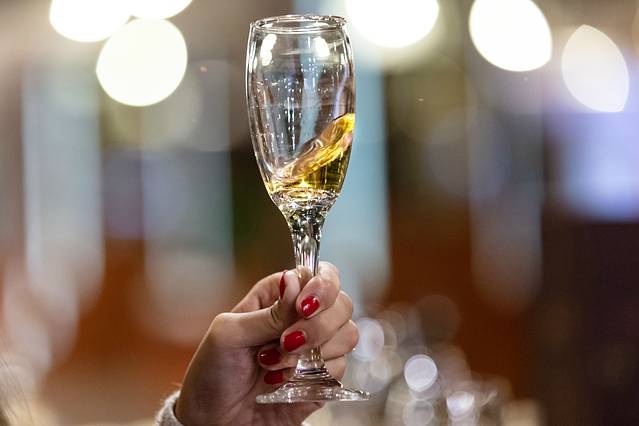 参观完灌装线来到品酒室。品葡萄酒的步骤要观其色、嗅其香、尝其味。先抓起酒杯的杯柱,看酒体颜色,再将酒杯轻轻晃动,让杯子里的酒和空气接触,进行充分的“呼吸”, 葡萄酒就会散发出各种迷人的香气。最后把酒轻轻地吸入口中,均匀分布在口腔并且含12秒,舌尖略带一点甜,两边是酸涩,舌根是苦。