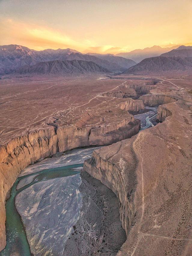 这已经不仅仅是壮观了。峡谷蜿蜒曲折的通向祁连山,层峦叠嶂的山峰被日落的光照的像水墨画,峡谷的悬崖也被勾上了金边。看着周围一望无际的戈壁,此情此景用“大漠孤烟直,长河落日圆”来形容再合适不过。
