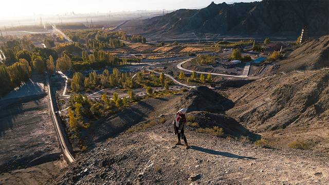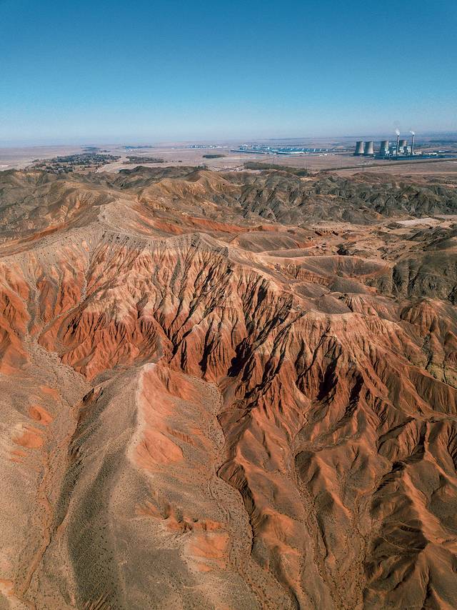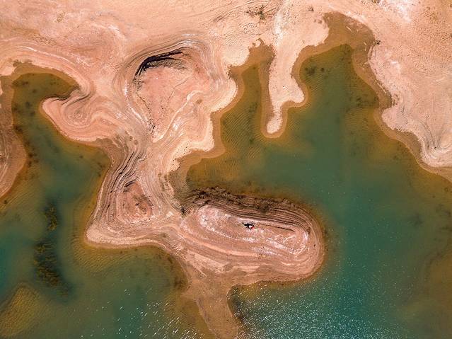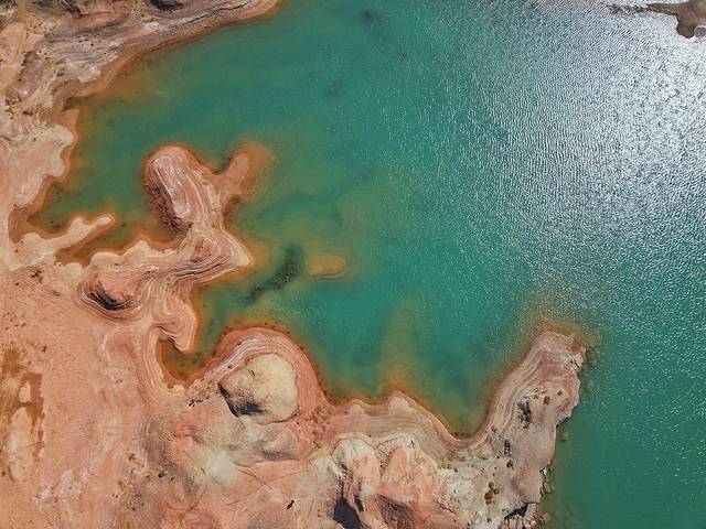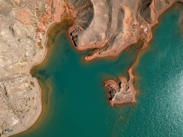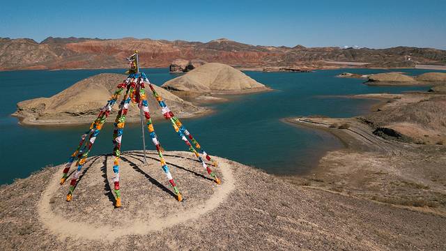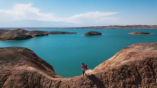 湖背后丹霞地貌的山坡,赤红、土黄、浅黛等各种颜色有条不紊地堆叠在山的切面上,在阳光的照射下愈发层次分明,不由得惊叹大自然的鬼斧神工。爬到了一个高处,眼前的景色更加豁然开朗。湖中央散落着一些土丘,用无人机从高空俯视下去,湖的形状就像花瓣一样,土丘和湖水交接的地方,泥土融入水里形成由深到浅的渐变色,就像调色盘里散开的颜料,一定是有上帝之手才能绘出眼前这幅景色。