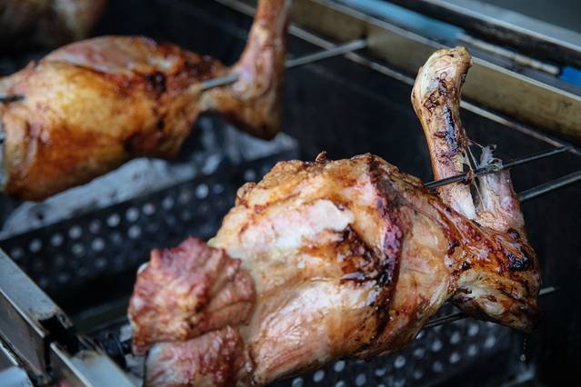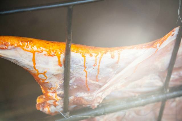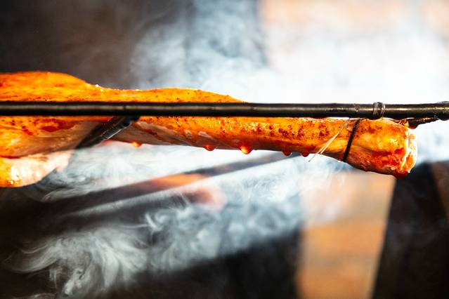 将羔羊整只架在烤炉上,刷上酱料腌制两到三个小时,再点上碳火手动翻转整只羊烤上一个多小时,烤肉滋滋发出声响, 一滴滴热油顺着饱满的肉的纹路慢慢滑下,令人心醉。慢慢的肉香弥漫了整个空气,馋虫迅速被勾起。烤出来的羊皮脆肉嫩,让人不禁大快朵颐,堪称人间美味。