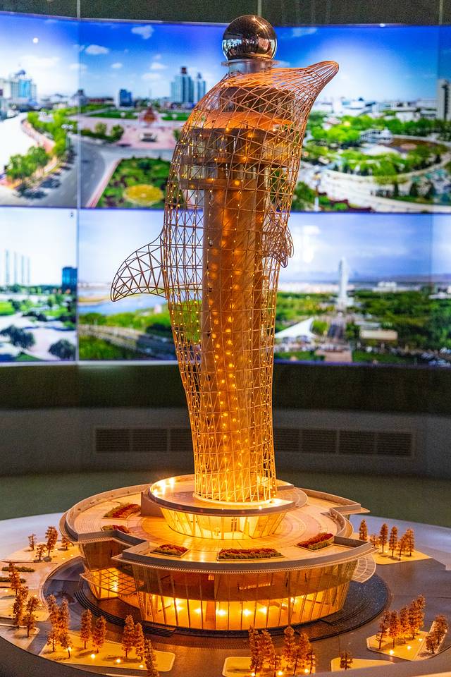 讲解员说之所以建成海豚的形状,是因为海豚是海洋里最团结的动物,嘉峪关在最初建设的时候就是比较干旱缺水,建成海豚的造型一方面是为了使嘉峪关人团结起来共建美好家园,另一方面也预示着今后能够风调雨顺。