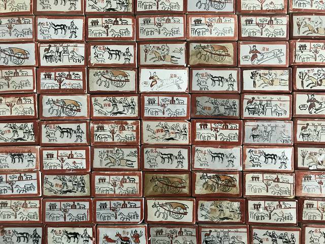 六号墓是已发掘的十三座墓中画像砖最多,最有代表性的一座,在墓室的132幅壁画中,主要有三个方面的内容:第一类表现了大量的生产劳动场面; 第二类画像砖描绘了奴婢们从事的屠宰、炊庖等各种杂役,和主人们宴饮美食的场面;第三类画像砖描绘了墓主人身为达官显贵时奢侈豪华的享乐生活。