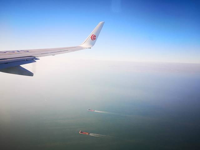 飞机快要降落,清晰见到海上航行的船,海天一色