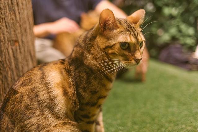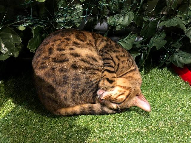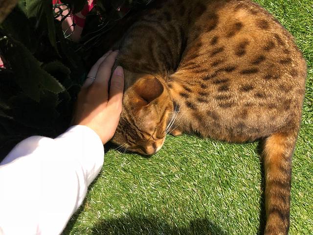 我刚进门的时候就惊呆了,里面每个人腿上都睡着一只孟加拉豹猫,感觉这里的猫咪都会做生意了,就躺在人身上睡觉让人撸,不禁感觉作为商业用途对猫咪是不是有点不人道。但是我坐在地上,没有猫来我腿上。豹猫的花色真的很酷,最后5分钟的时候有一只跑到我腿上来,让我有机会和酷酷的豹猫拍了几张照片。