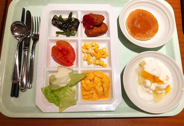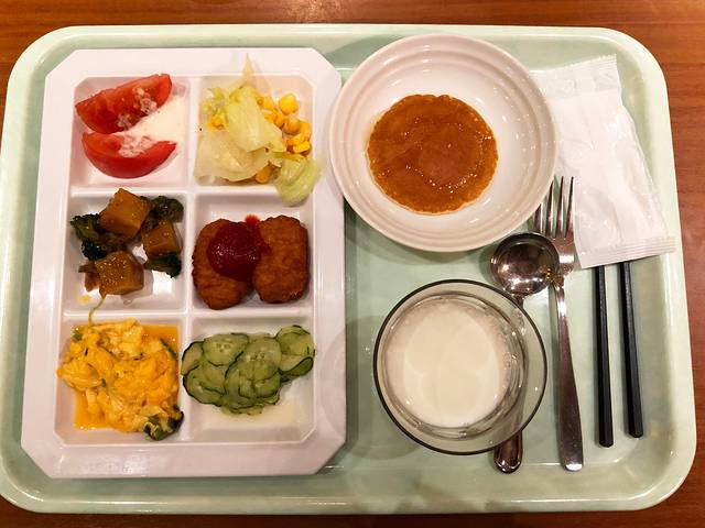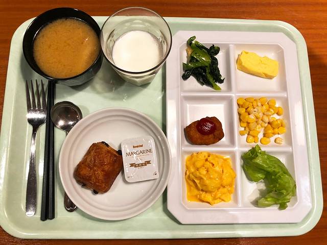 酒店的自助早餐,像食堂的餐盘一样选吃的,种类不是很多,我每天吃的都差不多。