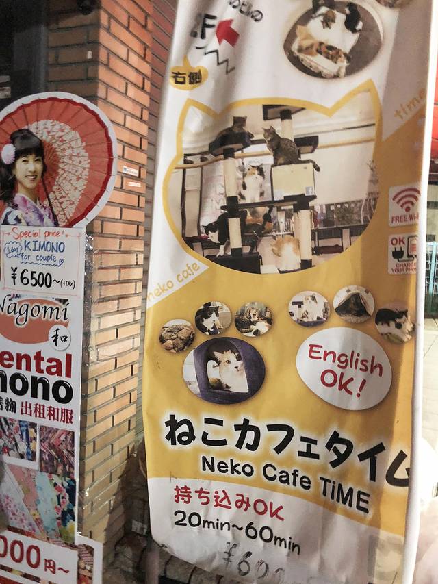 第一家推荐:【Neko Cafe】,我们从伏见稻荷大社出来,准备坐地铁去清水寺的路上,刚刚路过铁路口,我看到有卖烤番薯的小铺,我说买个番薯吧,然后在买的时候我看到旁边有张海报,Neko Cafe。