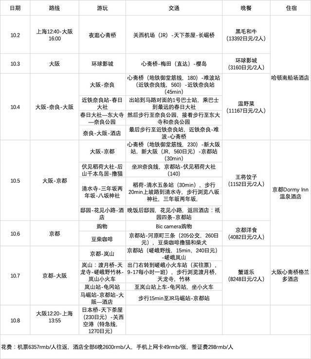 【交通】心斋桥(地铁御堂筋线,180)-难波站(近铁奈良线,560)-近铁奈良站(45min)。出站到马路对面的1号巴士站,乘巴士到最远的春日大社 ,然后步行至奈良公园,接着步行至东大寺和奈良公园,最后步行至近铁奈良站,近铁奈良 -难波-心斋桥。